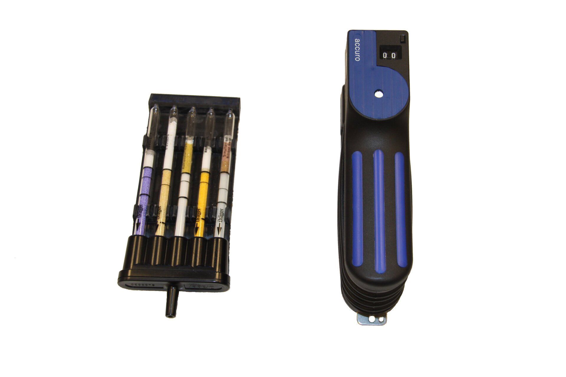 Prüfröhrchen sind trotz der vielen erhältlichen elektronischen Messgeräte immer noch sehr weit verbreitete Hilfsmittel für den Nachweis von gasförmigen Schadstoffen in der Luft. Die dünnen Glasrohre sind mit einem körnigen Trägermaterial gefüllt, dass mit chemischen Substanzen beschichtet ist, welche beim Durchleiten der Umgebungsluft mit dem nachzuweisenden Schadstoff reagieren. Durch die chemische Reaktion kommt es zu einer Farbveränderung der Röhrchenfüllung. Prüfröhrchen gibt es als Einzelröhrchen für die Konzentrationsmessung eines bestimmten Schadstoffs (Skalenröhrchen) oder in Form sogenannter Simultantests, mit denen unterschiedliche Stoffgruppen parallel nebeneinander nachgewiesen werden können. Damit insbesondere die Konzentrationsmessung richtig funktioniert, ist es wichtig, dass eine genau definierte Menge Luft durch das Röhrchen geleitet wird. Hierzu werden die Prüfröhrchen in spezielle Handspürpumpen gesteckt, die bei jedem Hub immer die gleiche Menge Luft ansaugen. Je nach dem, welches Röhrchen eingesetzt wird, muss eine vorgeschriebene Anzahl an Hüben ausgeführt werden. Dieses kann von Hand erfolgen oder die Handspürpumpe in einen Automaten eingesetzt, wie z.B. das Dräger X-Act 5000®, der automatisch die vorher eingestellte Anzahl an Hüben ausführt. Das Prüfröhrchensystem kann auch zur Probennahme eingesetzt werden. Dafür werden Röhrchen verwendet, die mit Aktivkohle oder Silikagel gefüllt sind. Hier erfolgt kein Farbumschlag, sondern der Schadstoff wird lediglich auf dem Trägermaterial angereichert. Das gut verschlossene Röhrchen wird dann in ein Labor geschickt, in dem die weitere Analyse erfolgt.