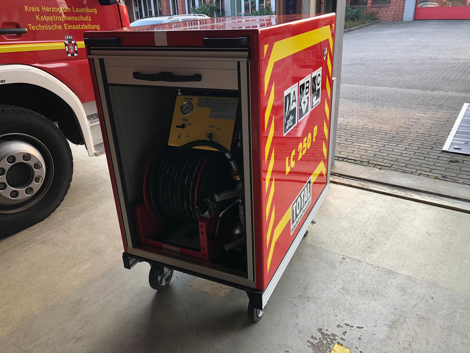 Nach dem LZ-G Erlass SH muss 250kg ABC-Löschpulver zur Unterstützung der örtlich Wehr vorgehalten werden. Dieser wird mittels Rollcontainersystem realisiert und ist ständig auf dem GW-L verlastet.